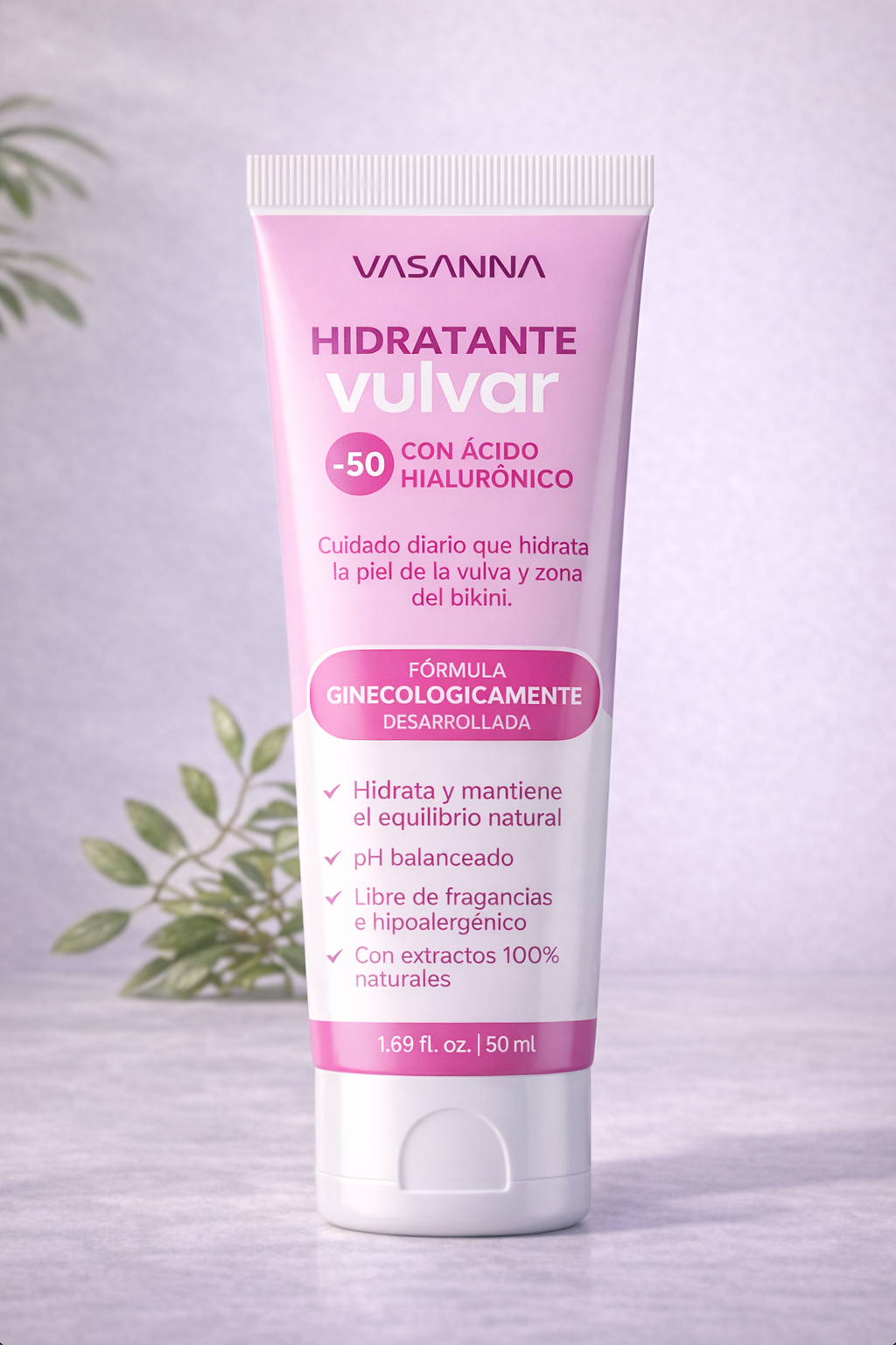 El hidratante íntimo VASANNA -50 ha sido diseñado especialmente para acompañar el cuidado íntimo femenino en la etapa previa a los 50 años. Su fórmula combina ácido hialurónico, vitaminas B3, B5 y E, junto con aceites humectantes y extractos naturales, que ayudan a mantener la hidratación, suavidad y confort de la piel delicada de la vulva.